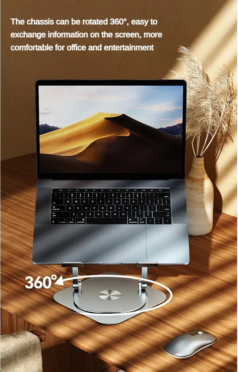 1.?Rotativo e ergonômico?Este suporte para laptop foi projetado com 360°rotação contínua, permitindo que você gire a tela do laptop em qualquer ângulo, enquanto você pode elevar o suporte do laptop até a altura certa, ergonomicamente projetado para sentar confortável, aliviando efetivamente dores no pescoço e nas costas.